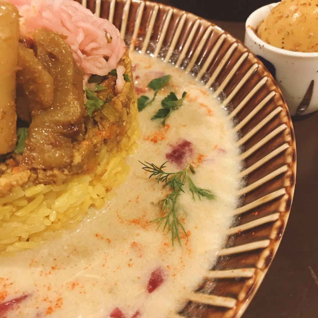 豆乳チャウダーの上にご飯とキーマがのっているという2層仕立て!