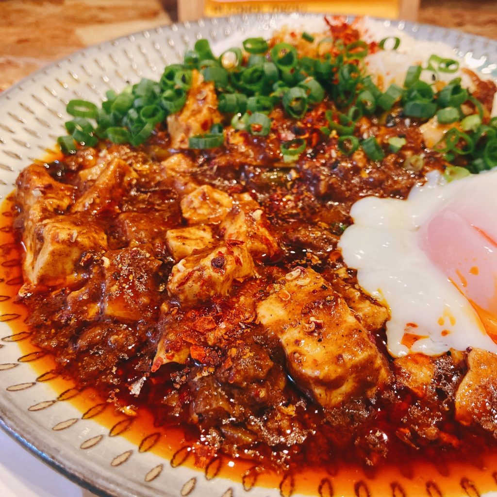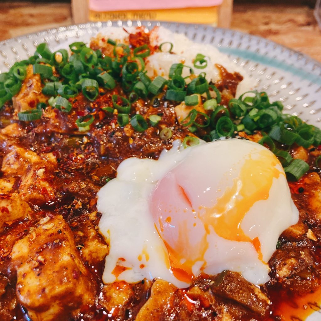 痺れて美味しい麻婆カレーが温泉玉子でやわらかい味に…。